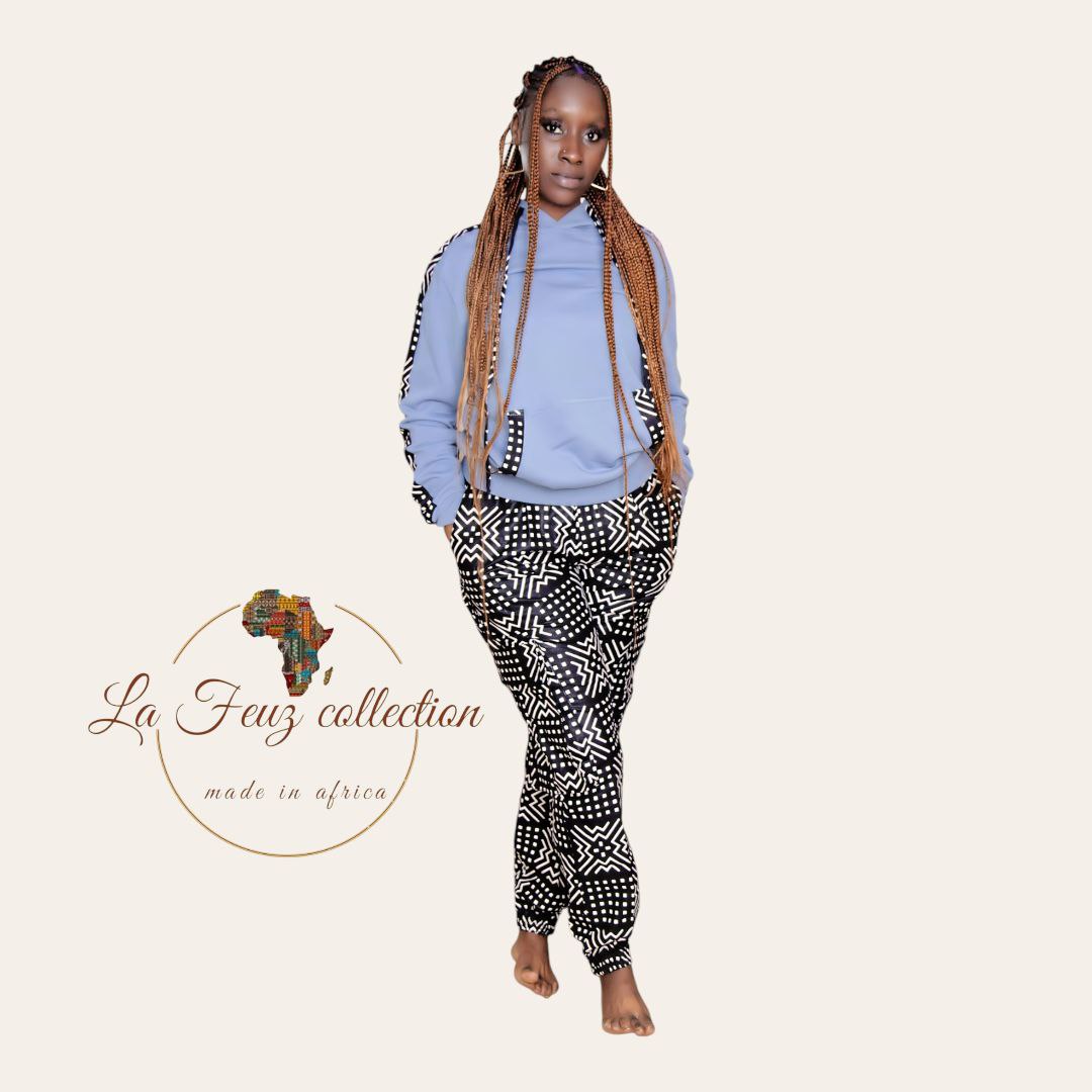 Ensembles gris noir patcher avec du wax Africaine aux motifs géométriques . Les ensembles sont composer de sweats à capuche gris et des pantalons cargo en wax noir et blanc.