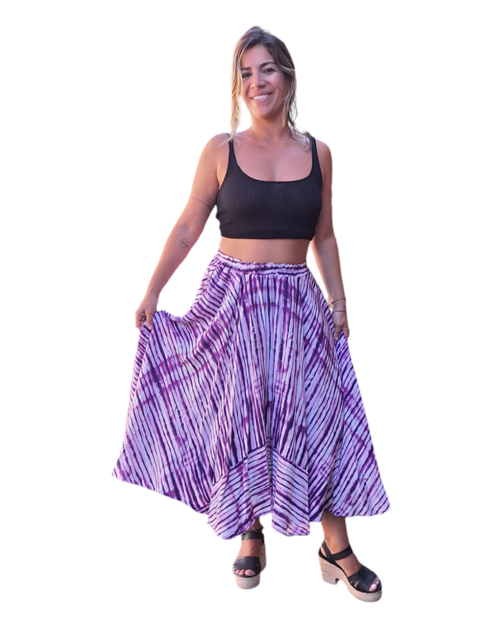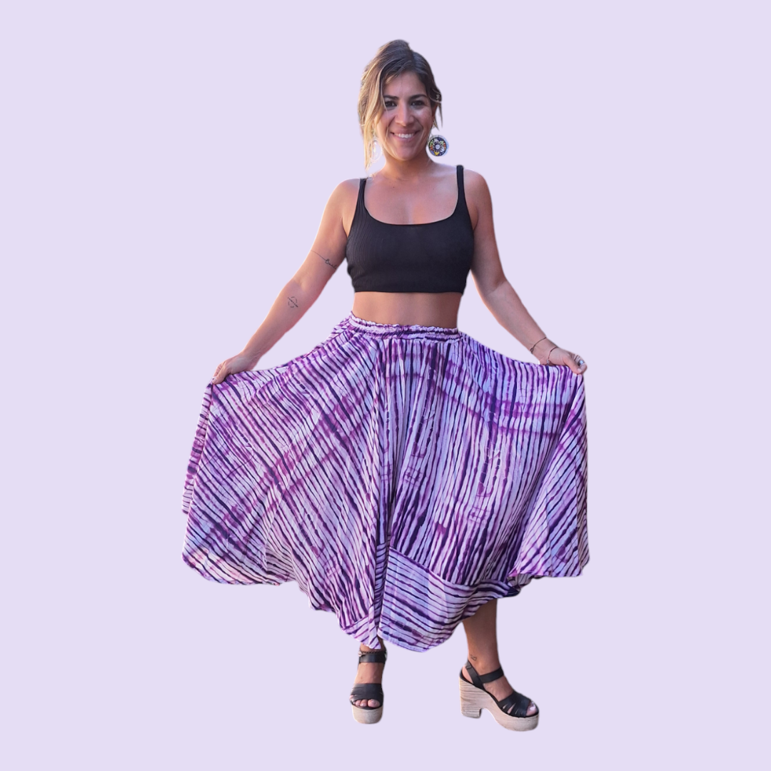 Bas : Jupe taille haute, longueur du sol, avec le même motif rayé.