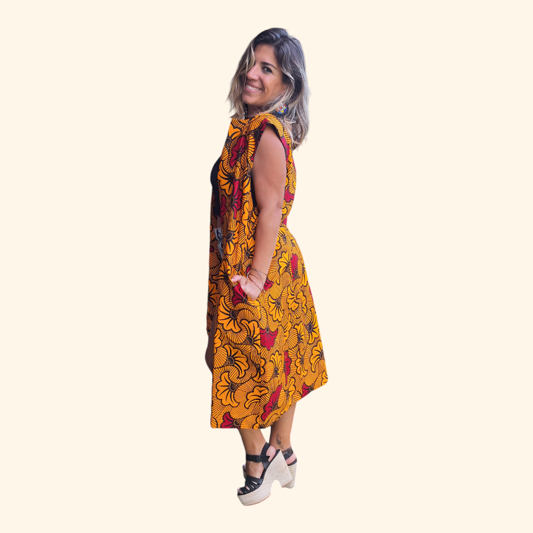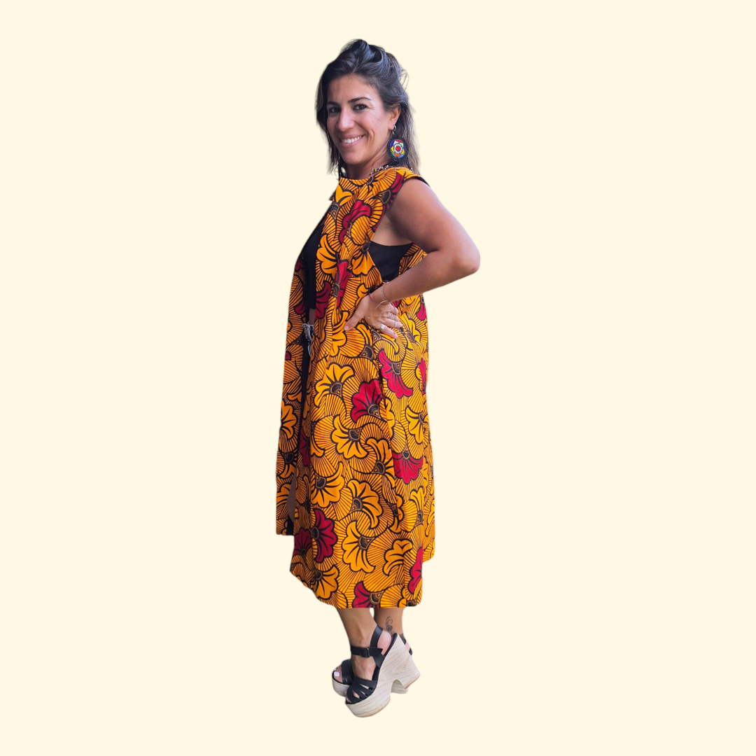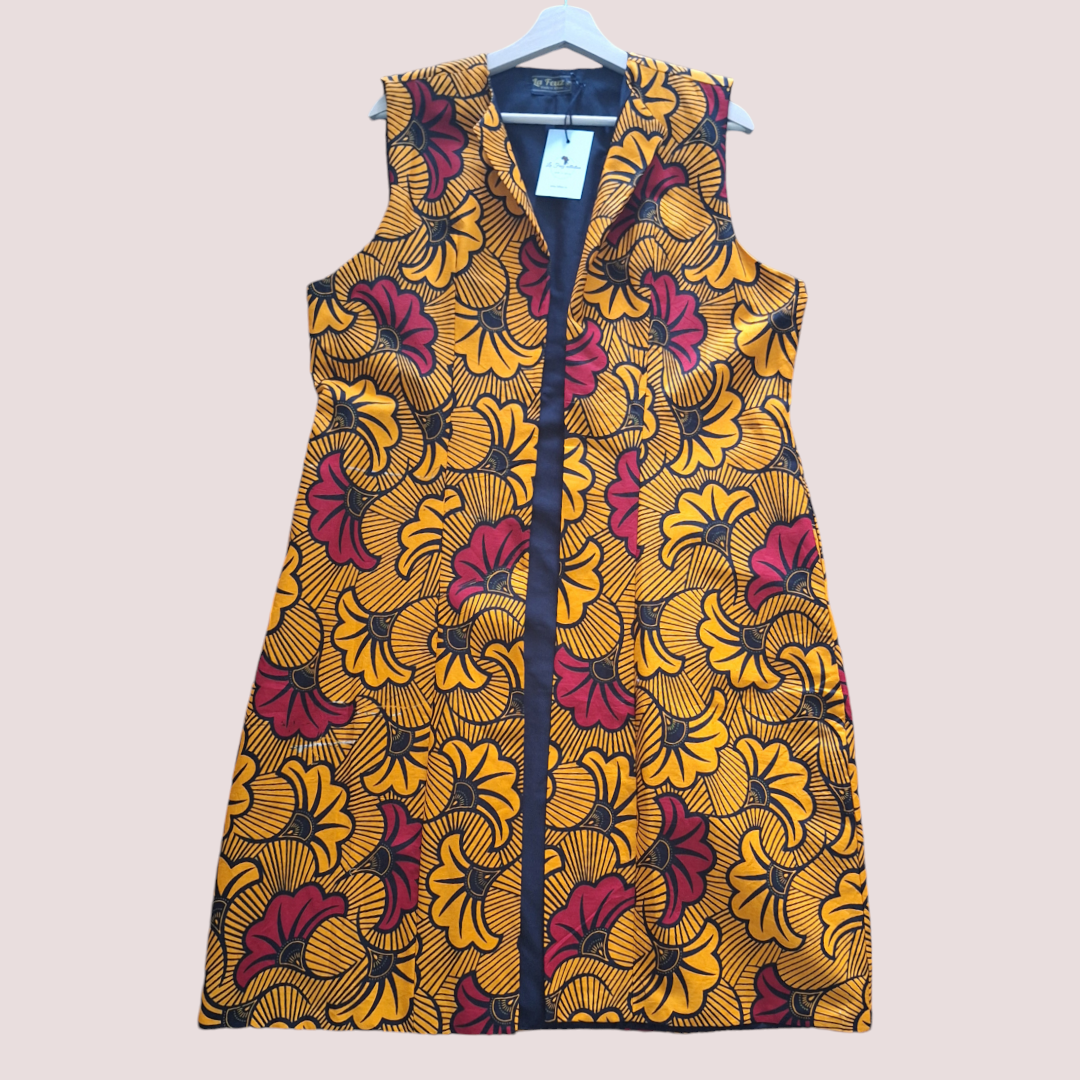 Un gilet avec un motif vibrant et coloré. Il a une base jaune ornée de grands motifs floraux dans les tons de rouge et d’orange. Il se porte ouvert sans fermetures éclair ni bétons. La longueur du gilet atteint environ la mi-mollet.