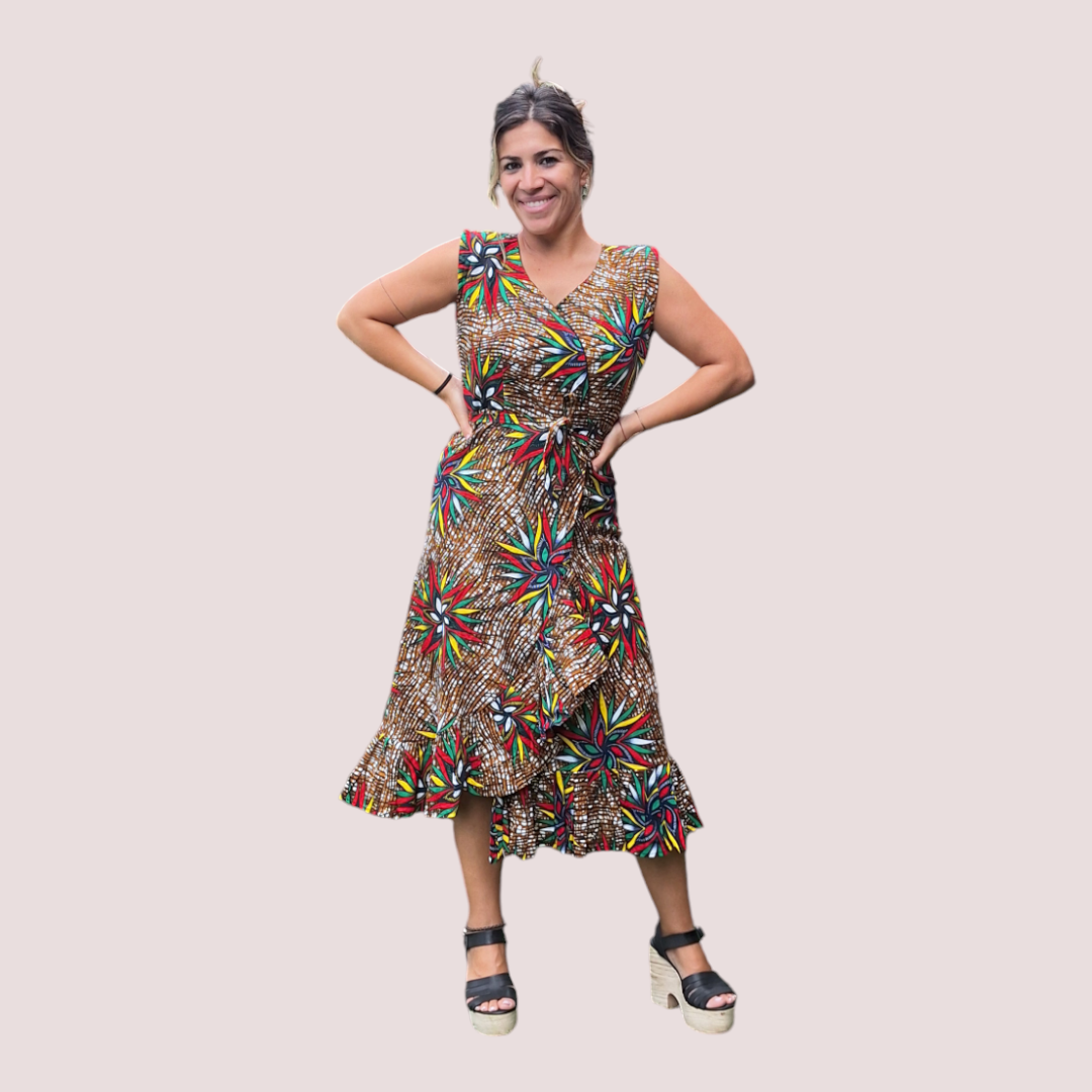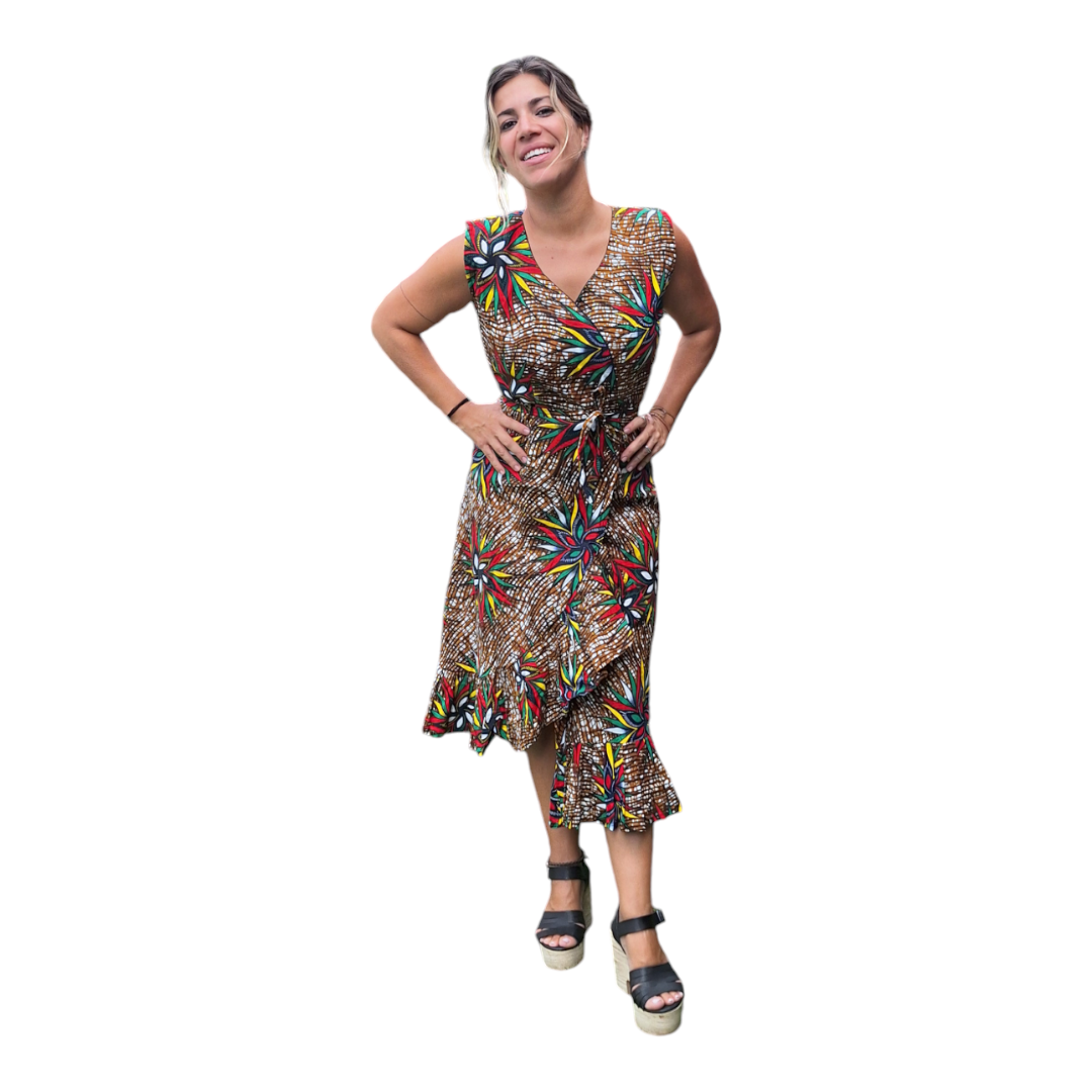 Robe mi-longue avec un motif multicolore vibrant qui présente des formes et des lignes géométriques. Il a une encolure en V, qui ajoute une touche élégante et féminine, les manches sont courtes, idéales pour les climats chauds. Il est parfait pour les événements décontractés ou semi-formels. Vous pouvez le combiner avec des accessoires simples pour laisser le motif de la robe occuper le devant de la scène.