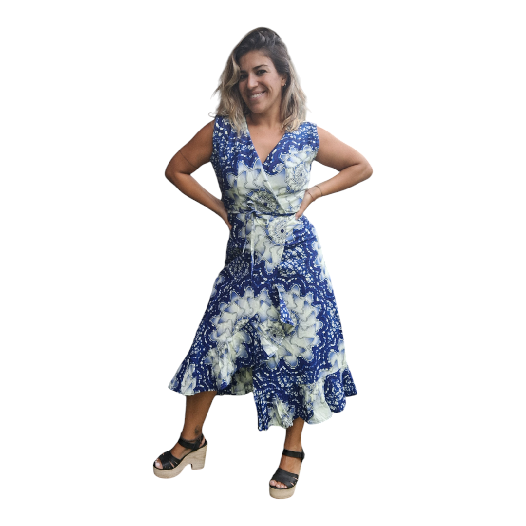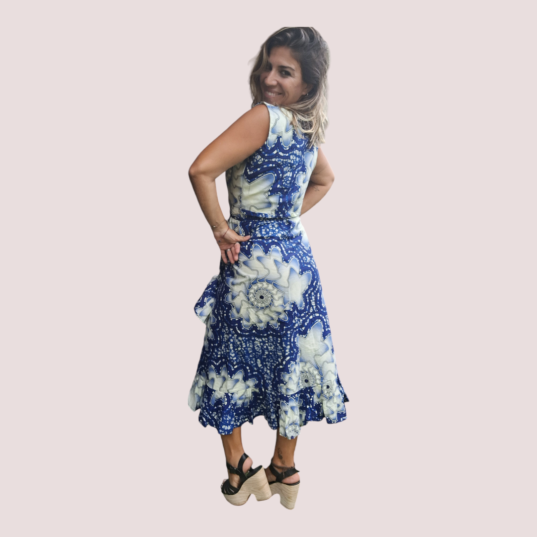 Vestido sin mangas con un escote en V. Es de longitud hasta la rodilla, con un dobladillo asimétrico que es más corto en la parte delantera y más largo en la parte trasera. Presenta un patrón floral con grandes flores blancas sobre un fondo azul.