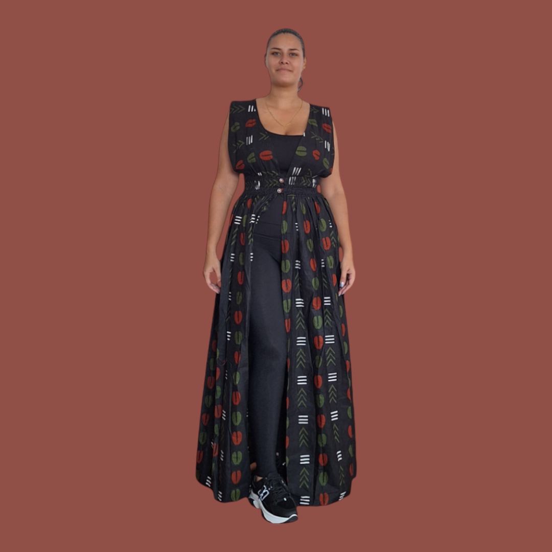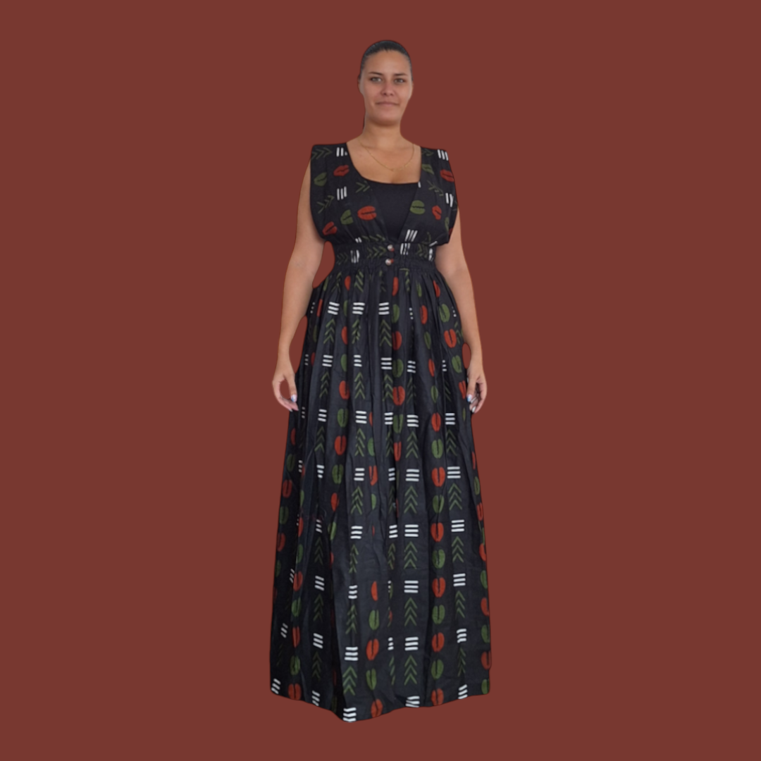 La robe est un vêtement long avec une couleur de base noire, qui présente un motif vibrant avec des accents rouges, verts et jaunes. Le design comprend des formes géométriques telles que des lignes et des rectangles. La robe a un décolleté en V et est sans manches, cintrée à la taille avec un cordon de serrage qui se noue à l’avant, créant un effet froncé. La jupe de la robe descend vers le sol.