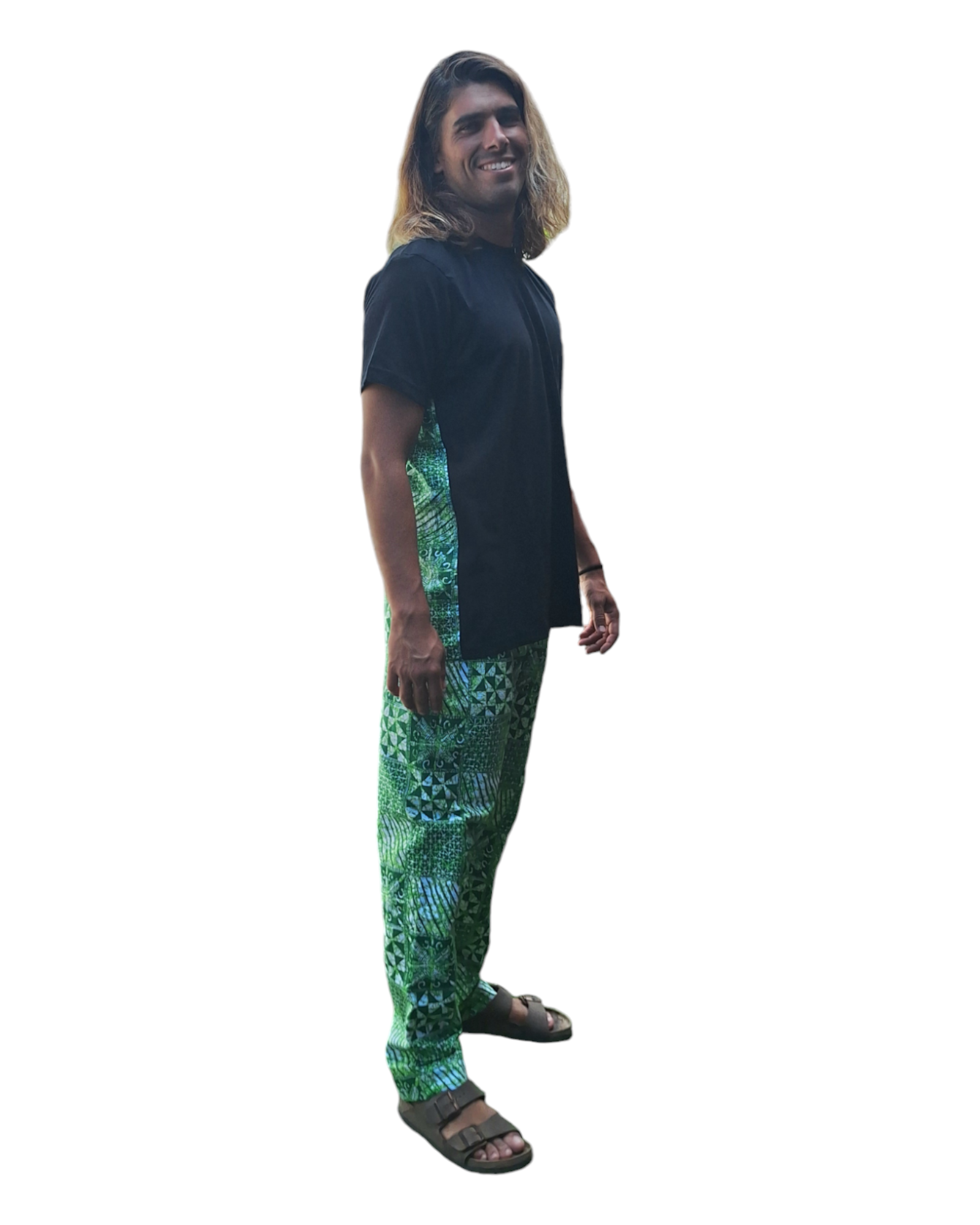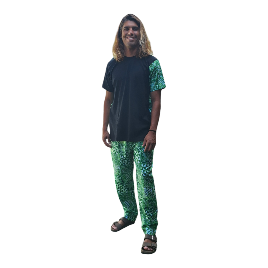 Un ensemble deux pièces composé d’un t-shirt et d’un pantalon. Le t-shirt est noire unie à l’avant avec des manches courtes, tandis que le pantalon a un motif de feuilles vertes rappelant le dos du t-shirt.